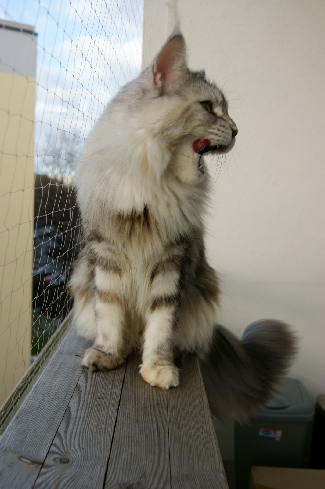 Ich kam da rein und mein erster Satz war, wie so üblich: Oh sind die kleiiiiiiiiin... Gemeint waren zwei Coonie-Damen und die EHK-Jungs. Ich wurde ein wenig beschnüffelt, meine Tasche wurde von Guinnie annektiert und als ich dann auch noch die Leckerlis rausgeholt habe, wurde ich sogar bestiegen. Also wortwörtlich jetz, ich hatte das erste Mal überhaupt ne Katze auf der Schulter... 4 Kilo Guinnie, ach wie süß :)
